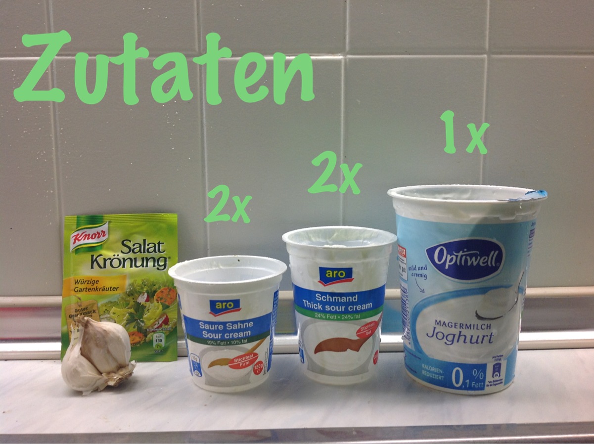 Das ganze Bechergedöns rührt ihr in einer Schüssel zu einer schönen Masse zusammen, geht am besten mit nem Schneebesen. Vom Knoblauch braucht ihr, je nach Belieben, 4-6 Zehen, die ihr durch die Knoblauchpresse jagt und mit dem Rest vermengt. Dazu kommen dann noch so 4-5 Tütchen Salatkräuter. Ihr könnt da wirklich jede beliebige Richtung wählen (je nach dem verändert sich der Geschmack später ein wenig, einfach probieren), super machen sich natürlich die Salatkräuter mit Knoblauch aber die hab ich gestern natürlich nicht gefunden. Das Einzige, was nicht zu empfehlen ist, ist Dill. Dann noch ein wenig Salz und Pfeffer dazu, abschmecken, evtl. noch ne Knoblauchzehe reinquetschen um am nächsten Tag den Kollegen zu ärgern, durchziehen lassen und sich unbedingt ein kleines Schälchen abzwacken, denn lange wird die Soße sicherlich nicht überleben!