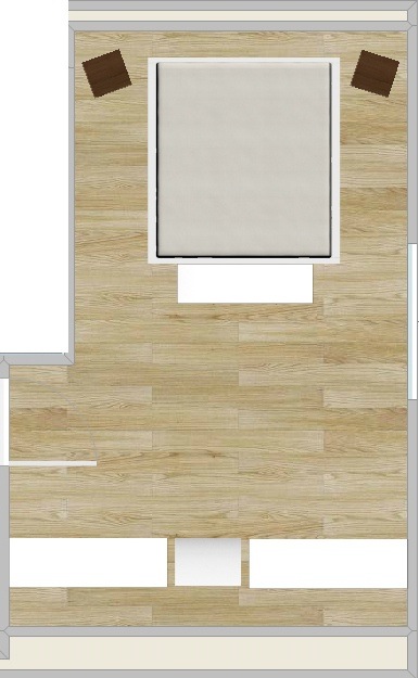 Ich denke soweit erklärt sich das von selbst. Der große Kasten oben ist das Bett, daneben die Nachttische, davor noch eine Kommode. Rechts an der langen Wand ist das Fenster, ganz unten sind die beiden großen Kommoden und die kleine Kommode in der Mitte aufgezeichnet. Durch die Schrägen können weder Bett noch Kommoden ganz an der Wand stehen, daher sieht es etwas komisch auf der Zeichnung aus 🙂 An der linken Wand ist die Tür eingezeichnet. So… und in Real sieht das ganze dann momentan so aus: